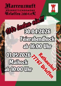 « Alle Veranstaltungen Feierabendhock & Maihock 2026 – Narrenzunft Meerrettichdämone Urloffen 2004 e.V. April 30, 2026 @ 10:00 - Mai 1, 2026 @ 23:00 « 21. ordentliche Jahreshauptversammlung – NZ Meerrettichdämone Urloffen 2004 e.V. Zum Kalender hinzufügen Google Kalender iCalendar Outlook 365 Outlook Live Details Beginn: April 30, 2026 @ 10:00 Ende: Mai 1, 2026 @ 23:00 Veranstalter Narrenzunft Meerrettichdämone Urloffen 2004 e.V. Veranstalter-Website anzeigen Veranstaltungsort Rathaushof Hauptstraße 12 Urloffen, Baden-Württemberg 77767 Germany Google Karte anzeigen
